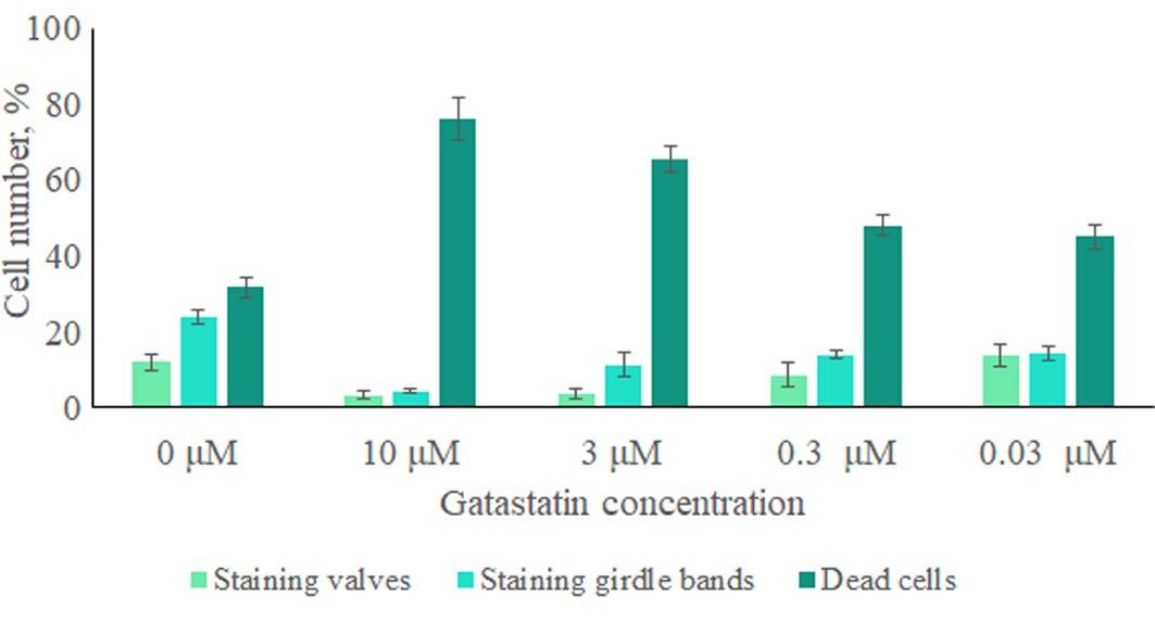 Для исследованного штамма было характерно присутствие в культуре не менее 30 % погибших клеток (Рис. 4). Большинство клеток активно формировали створки и поясковые ободки. При всех концентрациях гатастатина количество мертвых клеток было выше, чем в контроле. Наиболее низким было количество сформированных створок при концентрациях гатастатина 3 и 10 мкM, тогда как при концентрации от 0,03 до 3 мкM количество поясковых ободков оставалось ниже, чем в контроле, но было почти одинаковым (Рис. 4). При концентрациях 3 и 10 мкM, все сформированные створки имели изменения в морфологии.