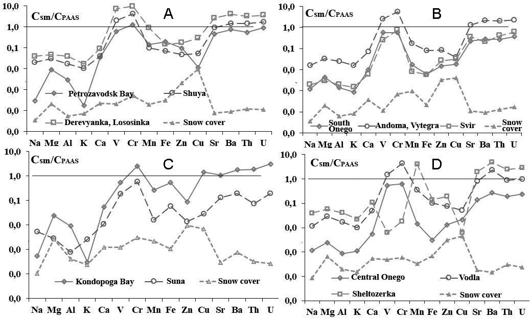 Fig. The spectrum of element contents in the suspension of the waters of the rivers, snows and Lake Onego, normalized to PAAS: A - Petrozavodsk Bay, r. Shuya, Derevyanka, Lososinka; B – South Onego, r. Andoma, Vytegra, Svir; C – Kondopoga Bay, r. Suna; D – Central Onego, r. Vodla, Sheltozerka.