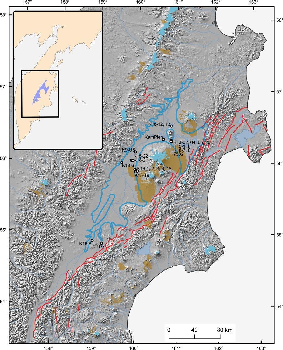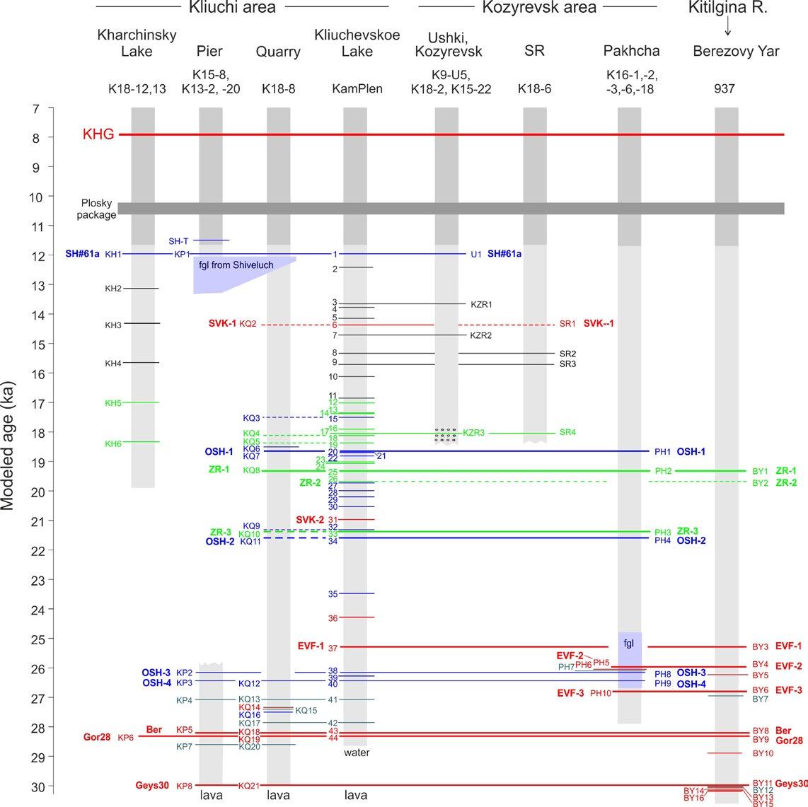 All the studied sites are located below 160 m a.s.l., at heights 10-155 m above the CKD drain. There are no recent topographic barriers in most of the CKD, and the Last Glacial Maximum in Kamchatka is estimated to be no more than piedmont glaciers (Melekestsev et al., 1974). Therefore, the lake extent bounded by the CKD topography is estimated to be ~10 000 km2. The age of studied deposits is 11-30 ka, whereas most of the sections are tied together by tephras in the time range between 19.3 ka (ZR-1) and 29.9 ka (Geys30).