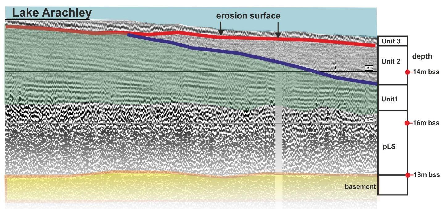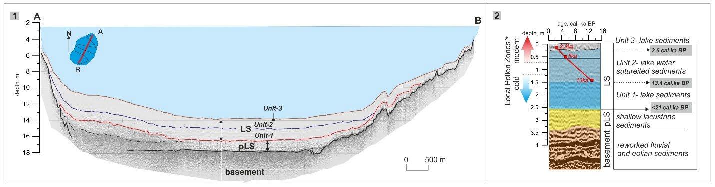 Age estimation and regional pale-reconstruction based on investigation of bottom sediment Lake Arakhley are still rare. Our interpretation of seismic pattern and age estimations based on Reshetova et al. (2013) and Solotchina et al. (2018). The uppermost 1.27 m from lateral part of the lake was dated by 15 cal. ka BP (Solotchina et al., 2018). There are the pollen record and radiocarbon age estimation for the core located near discussed seismic profile showed in figure 2, the uppermost 1.44 m of the LS was formed during 13 cal. ka (Reshetova et al., 2013). In addition, this core was sampled from the part of lake with lacustrine condition during the regression described above. Thus, the depth-age is practically line, and it can be evidence of the absence of a gap in sedimentation between the unit-3 and 2.