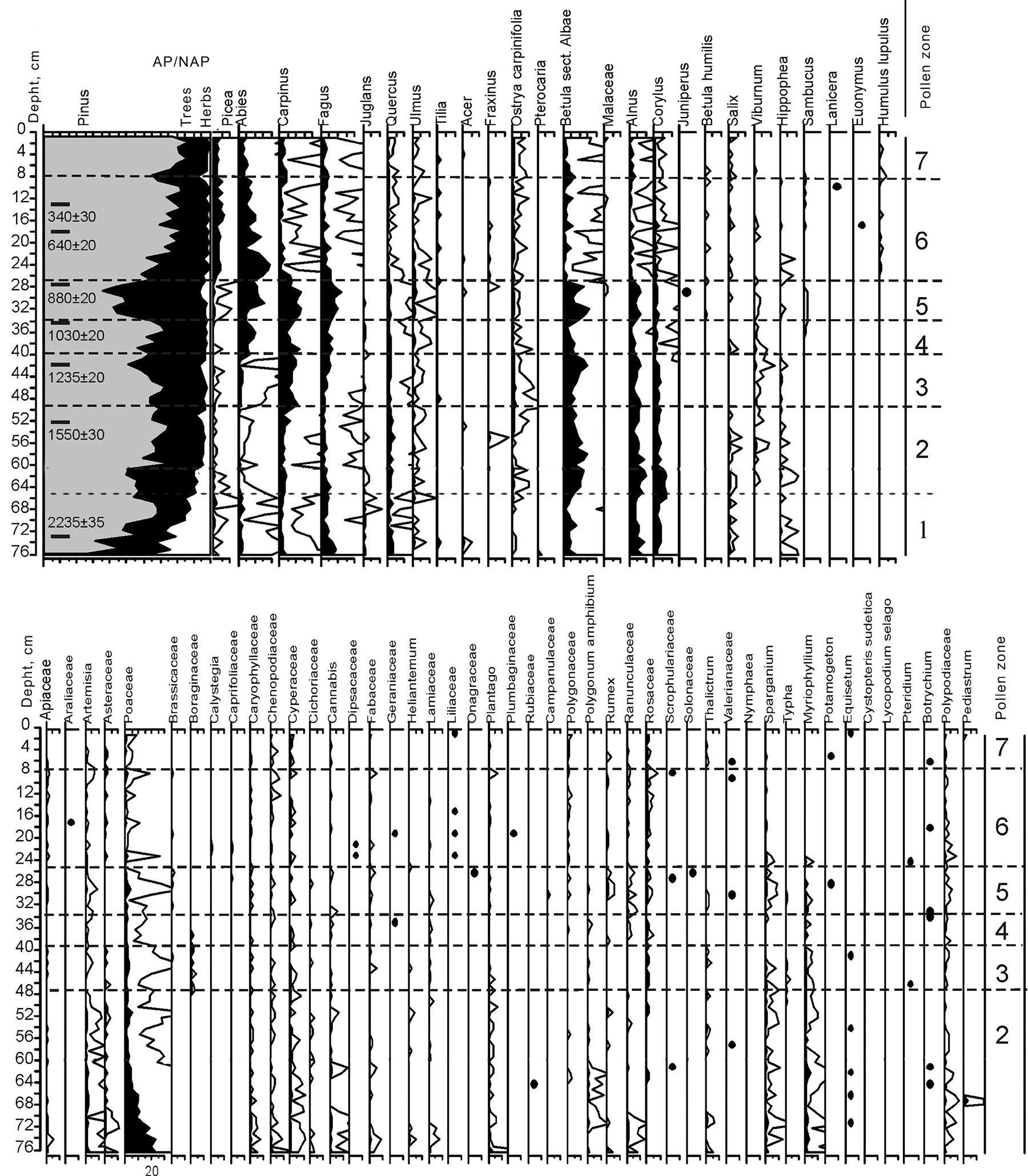 LPAZ 1 (76-65 cm; 2200-2000 cal yr BP). Pollen assemblages are characterized by a relatively high NAP content (up to 35%) dominated by Poaceae and Asteraseae (Artemisia). Pollen values of arboreal taxa increase from 65 to 90% towards the upper part of the zone. Pinus pollen is the most abundant. The permanent components of pollen assemblages is Alnus, Corylus and Betula sect. Albae. Pollen of broadleaved species (Quercus, Carpinus, Fagus) and coniferous trees such as Abies and Picea occur in a minor quantity. Pollen of light demanded plants as Hippophaea and Helianthemum sp. were registered.