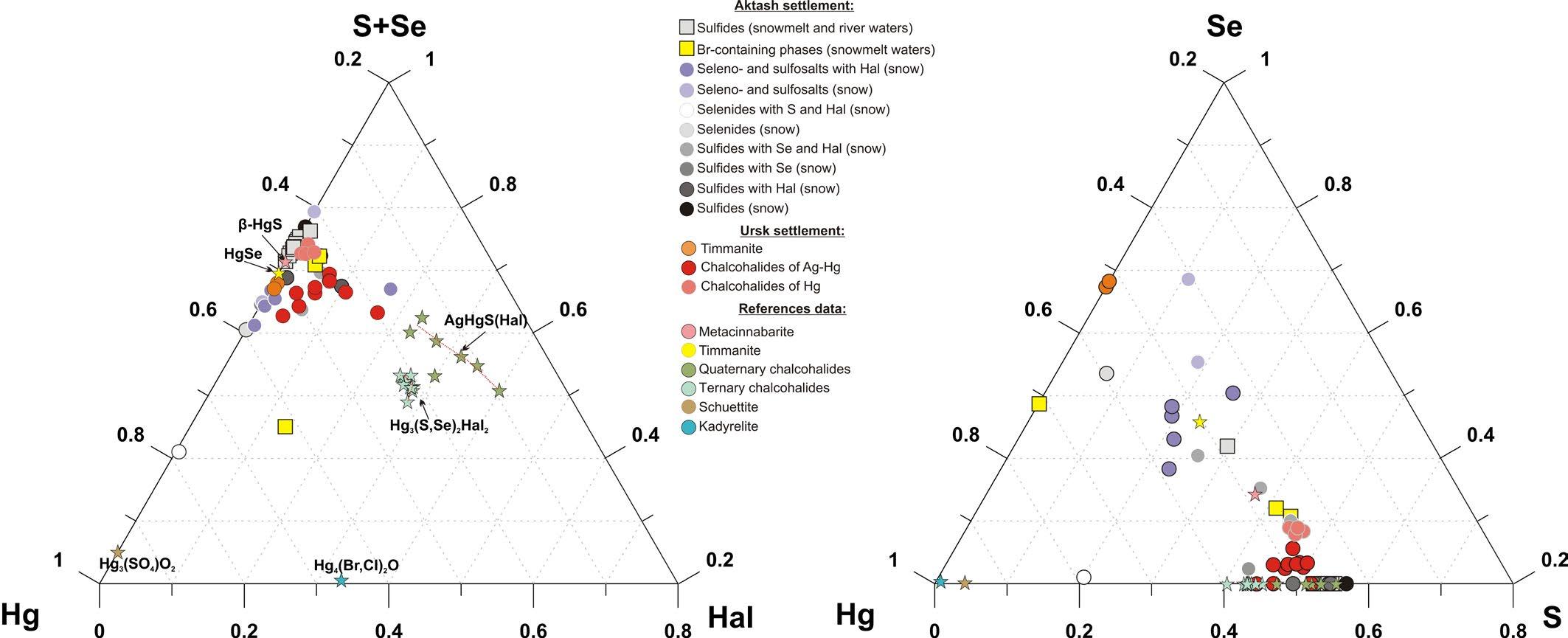 3. Fig.2. Triple diagram (Hg – S+Se – Hal and Hg – Se – S systems, where Hal = the sum of I, Br and Cl) of the composition of Hg minerals (atomic ratios) in the studied samples of the Salair (Ursk settlement) and Kurai (Aktash settlement) mercury zones according to reference data (stars mark the electronic mineralogical sources mindat.org and webmineral.com): Kadyrelite (Hg4(Br,Cl)2O); Schuettite (Hg3(SO4)O2); Ternary chalcohalides with the general formula of Hg3(S,Se)2Hal2 where Hal = I, Br and Cl; Quaternary chalcohalides with the general formula of AgHgS(Hal); Timmanite (HgSe), and Metacinnabarite (β-HgS).