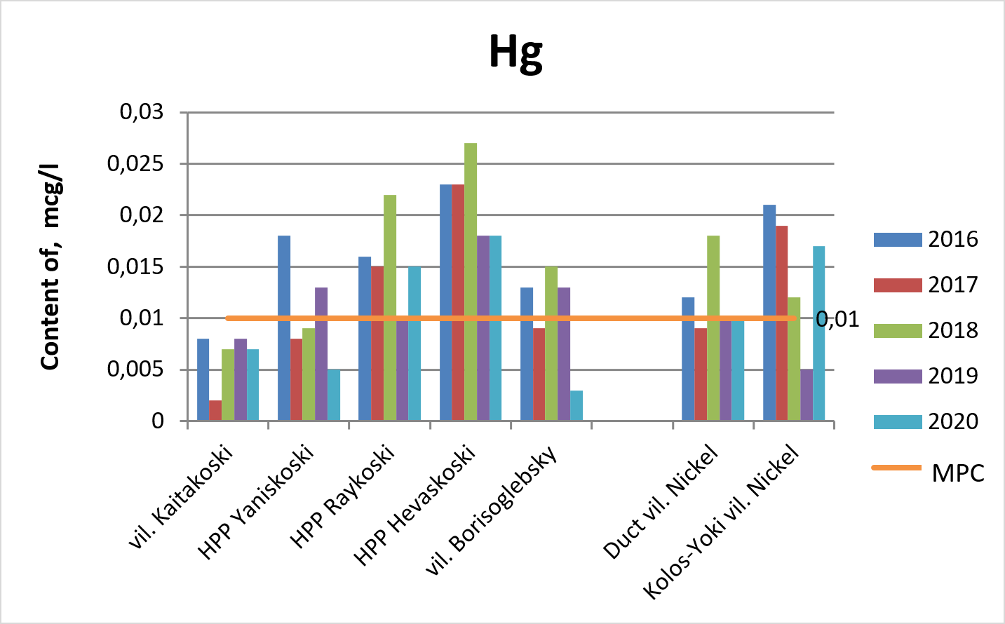 Near the dam of the Hevaskoski Hydroelectric Power Plant (HPP), there were the most significant concentrations of mercury compounds. As this is the border with Norway, and there are no production facilities in this area, we can state that this is the consequence of the natural accumulation of mercury in the bottom sediments as well as of relatively recently created reservoir (the Hevaskoski HPP was the last constructed in the cascade of reservoirs) that was dispersed in the geochemical landscape of the region. In the Borisoglebskaya HPP of the Paatsjoki River, which is the last downstream and located farther off the confluence with the Kolosjoki River, the concentrations of mercury compounds were almost the same as in the Kolosjoki River, and the water quality varied from the third class of grade “a” (“polluted”) to the second class (“weakly polluted”). Hence, the elevated concentrations in the surface waters of the region were due to the geochemical conditions.