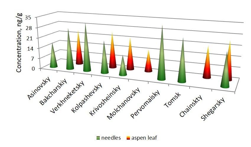 A more detailed analysis of the Bakcharsky District indicated that Hg concentration both in needles and in poplar leaves was significantly lower than in adjacent environments: sphagnum peat and swamp waters (Domarenko et al., 2017). The excess ratio of the mean mercury concentration in peat to needles ranged from 1.5 to 46 times, and in swamp waters - from 4 to 39 times. For aspen leaves, the indicators were as follows: in peat - from 1.3 to 3.5 times and in swamp waters - from 3.4 to 29 times. Among the wide species diversity of coniferous tree species in the region, the data on Hg concentrations in pine and cedar needles are the most widely presented.