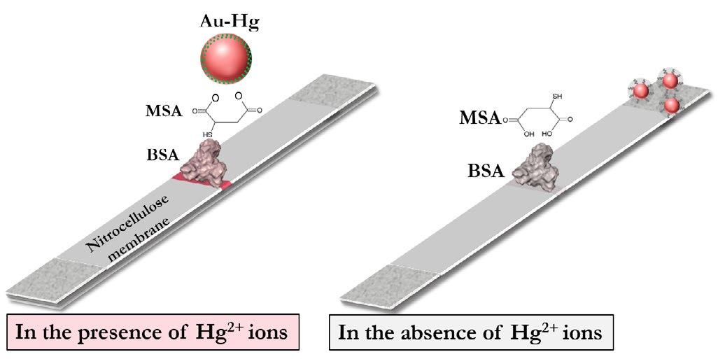 The principle implemented in this study consists of the interaction of mercury ions with gold nanoparticles (AuNPs) and citrate ions immobilized on their surface, followed by complexation with mercaptosuccinic acid (MSA) in the test zone of the membrane. Thus, contact of the test strip with the sample without any additional action leads to the appearance of a colored zone on the membrane.