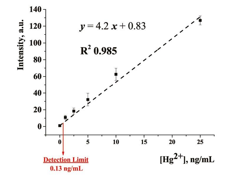 Currently, mercury pollution of natural objects is becoming an essential problem, which has been significantly intensified due to urbanization and the increase in industrial waste volumes. The movement and accumulation of mercury in the food chains of ecosystems cause risks to human health. The high toxicity of mercury determines the need for its monitoring in environmental objects (Gworek et al., 2020). The maximum permissible concentrations of Hg2+ ions in drinking water have been established by various organizations and vary from 0.5 to 6 ng/mL (US EPA, 2009; GOST, 2011; WHO, 2017). Chromatographic and electrochemical methods are mainly used to detect such low concentrations (Saleh et al., 2020). However, their implementation requires stationary expensive equipment, which limits productivity and increases the cost of testing, significantly lengthening the time required for decision making. These limitations can be overcome only with the widespread introduction into the practice of highly sensitive, productive, and simple methods of non-laboratory testing.