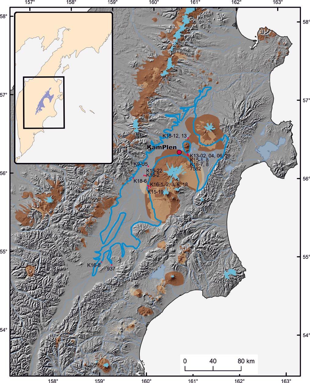 Fig. Location map after Ponomareva et al. (2021) showing studied sections (red circles, KamPlen key site labelled in bold), and suggested extent of the CKD lake basin (blue outline in the figure and blue shade in the inset). Modern glaciers are shown in turquoise, Holocene volcanic deposits including debris fans are in light brown, Late Pleistocene volcanic deposits are in dark brown.