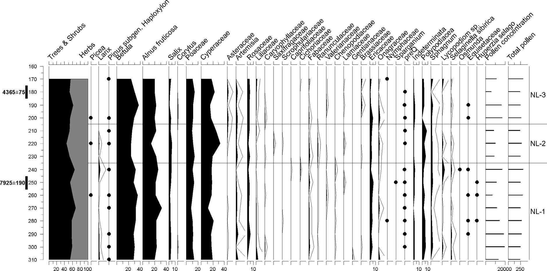 Palynozone NL-1 (310 - 235 cm) shows the predominance of the pollen of trees and shrub, especially of Betula (up to 30%), Alnus fruticosa (about 20%) as well as Salix and Larix. The pollen of Cyperaceae and Poaceae are dominated among herbaceous taxa, and the pollen of Rosaceae and Ericaceae also occur.