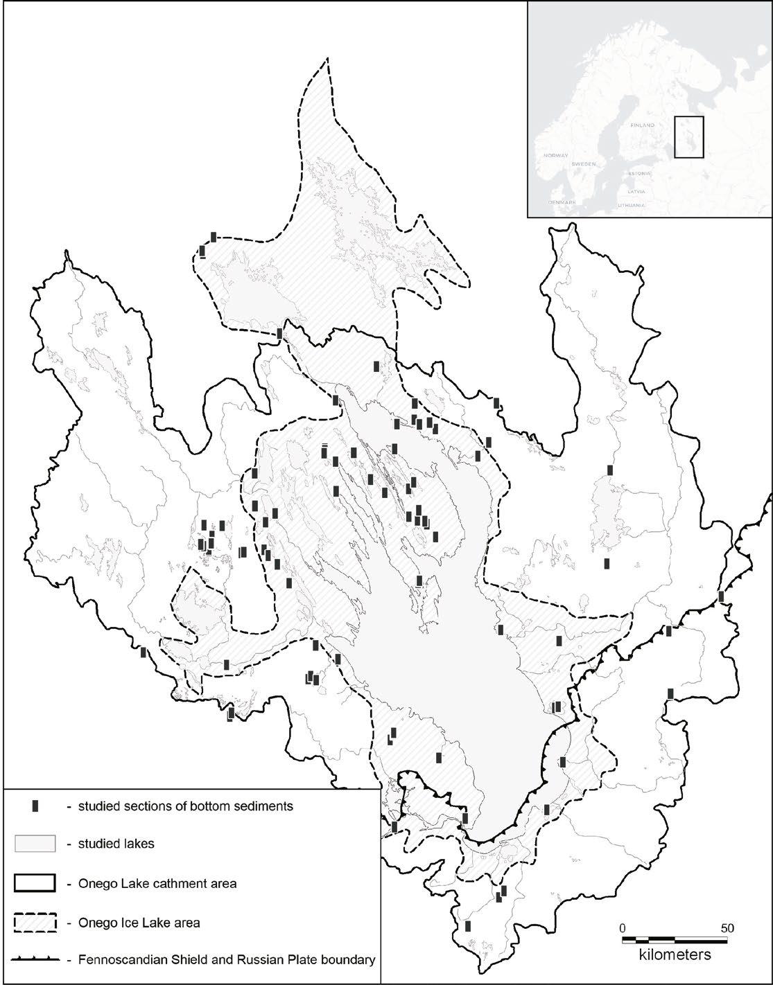 Structure of lake basins and bottom sediments relates to the local geologic and geomorphologic features and history. The catchment area and lake depression are located in the nortwest of the East European Platform on the border of the crystalline shield and the sedimentary plate (Fig.). During the Last Glacial Period, they were in the marginal flank of the glacier. The Onego Ice Lake (OIL) was formed in the lake depression in the Late Glacial. The proglacial lake extended beyond the resent watershed on the maximum stage of its development (Subetto et al., 2019; Zobkov et al., 2019).