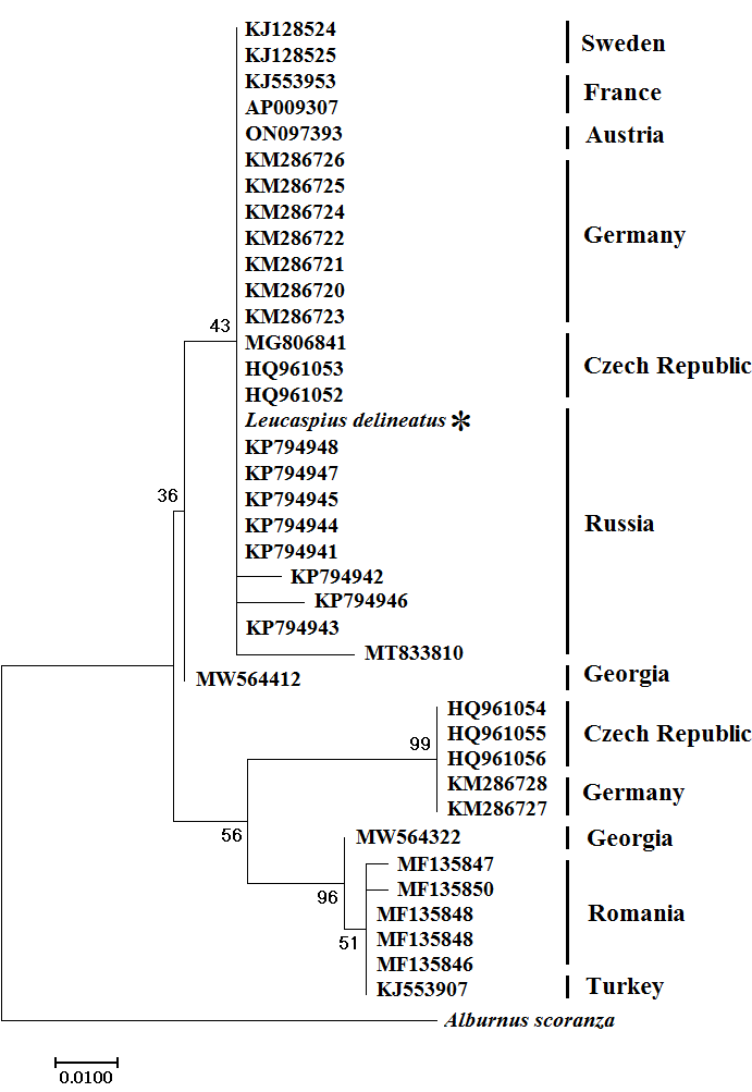 Determination of the species specific fragment of the Cox1 gene allowed identification of a single haplotype found in all specimens. Comparative analysis and phylogenetic reconstruction based on the nucleotide sequences accessible in the genetic databases showed that the studied species is represented by three phylogenetic lineages (Fig. 3). The nucleotide differences of the fragments of the Cox1 gene in sunbleak in the comparative data analysis from the GenBank database were 5.5%, and within the phylogenetic lineages the nucleotide sequences differed by < 3%.