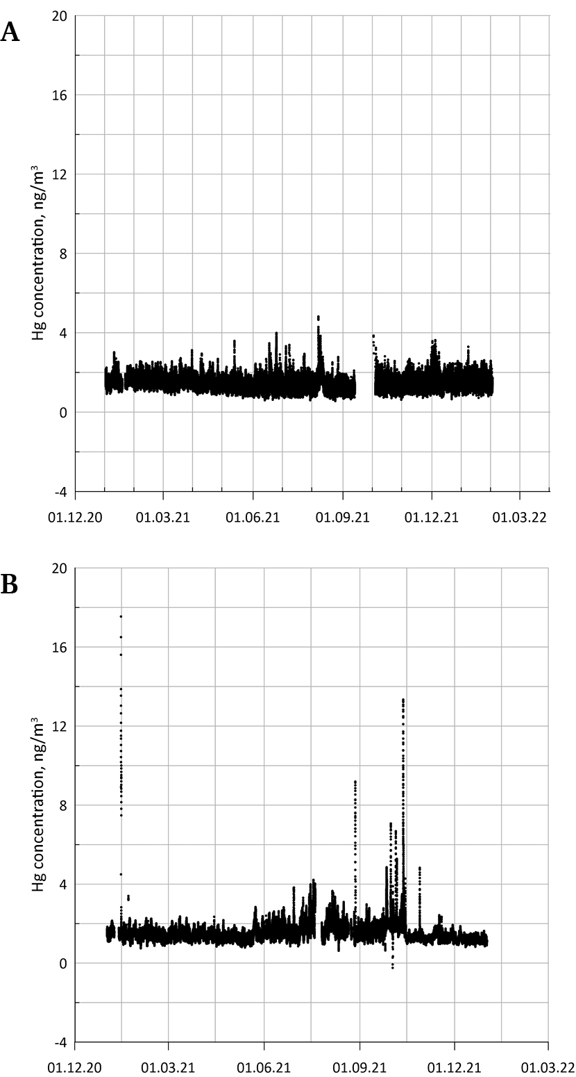 Fig.2. Background mercury monitoring of ambient air during a year at the Listvyanka (A) and SAWS Cape Point (B) monitoring stations. Courtesy of LIN and SAWS.