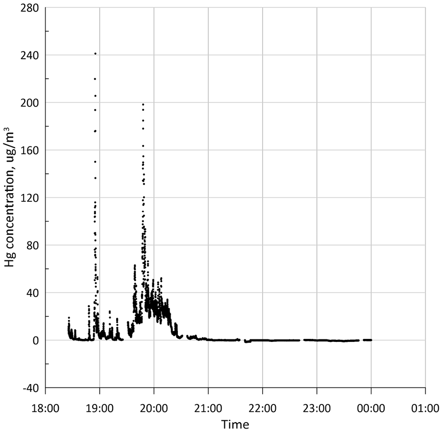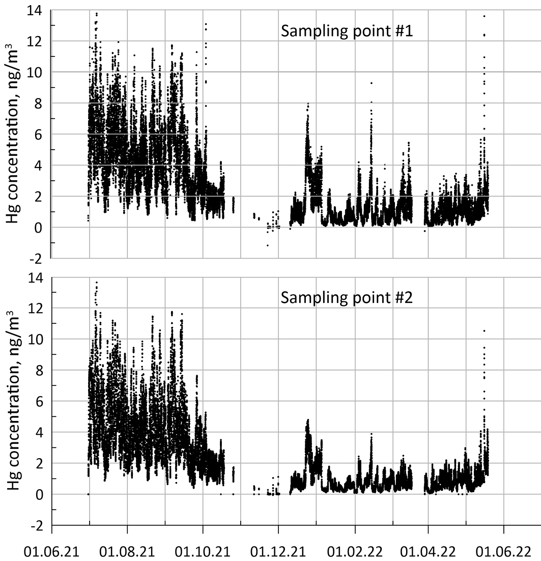 An example of indoor mercury monitoring at two sampling sites of a mercury storage facility during one year is shown in Fig. 3. The maximum mercury concentration of about 14 ng/m3 that does not exceed the threshold limit value (TLV = 0.025 mg/m3) averaged over an 8-hour work shift. The differences in mercury concentrations at different levels are rather small, which indicates good ventilation in the storage facility.