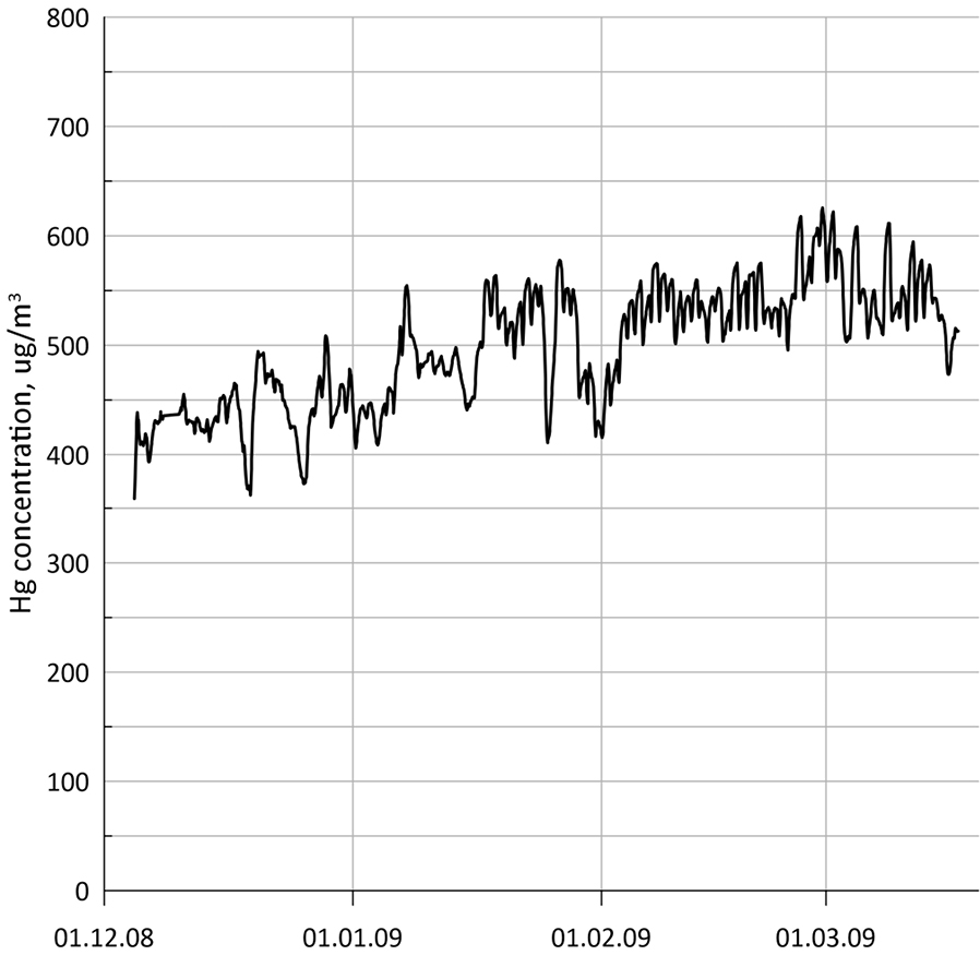 Mercury concentration in hydrocarbon gases varies in a wide range, covering six orders of magnitude (Ozerova et al., 1999). A high Hg concentration in hydrocarbon gases poses some technological and environmental problems (contamination of equipment and products, poisoning of catalysts) and initiates intense corrosion of technological equipment, thereby enhancing accident risk. An example of the mercury monitoring in natural gas is shown in Fig. 4. A special concern is mercury in gas used for liquefaction when the volume of liquefied gas has a 600-fold decrease, and liquid mercury can precipitate even from a gas with a low Hg concentration. Therefore, for liquefaction, the Hg concentration must be brought down to a value below 10 ng/m3.