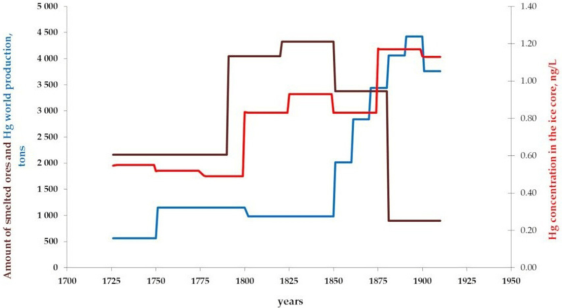 Fig.1. The amount of smelted ore (tons*10) in Altai mining district, world mercury production and average 25-year Hg concentrations record in the Belukha ice core.
