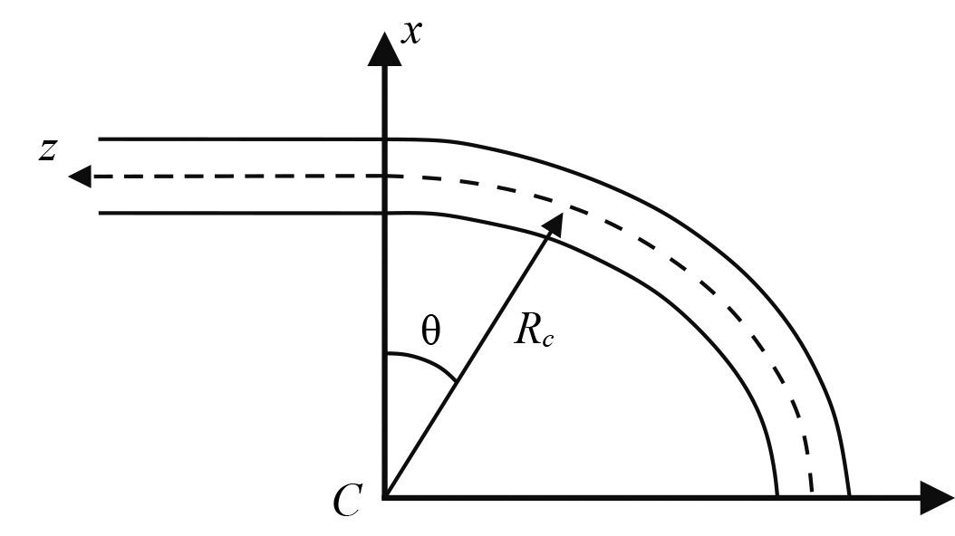 В случае изогнутого участка световода пусть θ – угловая координата по изгибу, отчитываемая от оси x; Rc – радиус кривизны с центром в точке C вне волновода, постоянный относительно оси изгиба; z – расстояние вдоль изогнутого участка (рис. 1). Пунктирная линия – ось волновода, ось y направлена перпендикулярно плоскости рисунка.