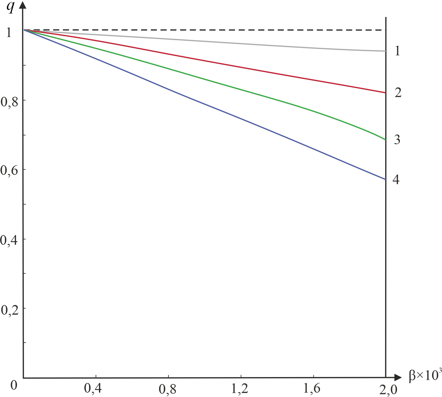 Fig. 2. Dependence of the ratio q on the parameter β for different values of the waveguide parameter V: (curve 1 – V1 = 0.5; curve 2 – V2 = 0.9; curve 3 – V3 = 1.3; curve 4 – V4 = 1.7)