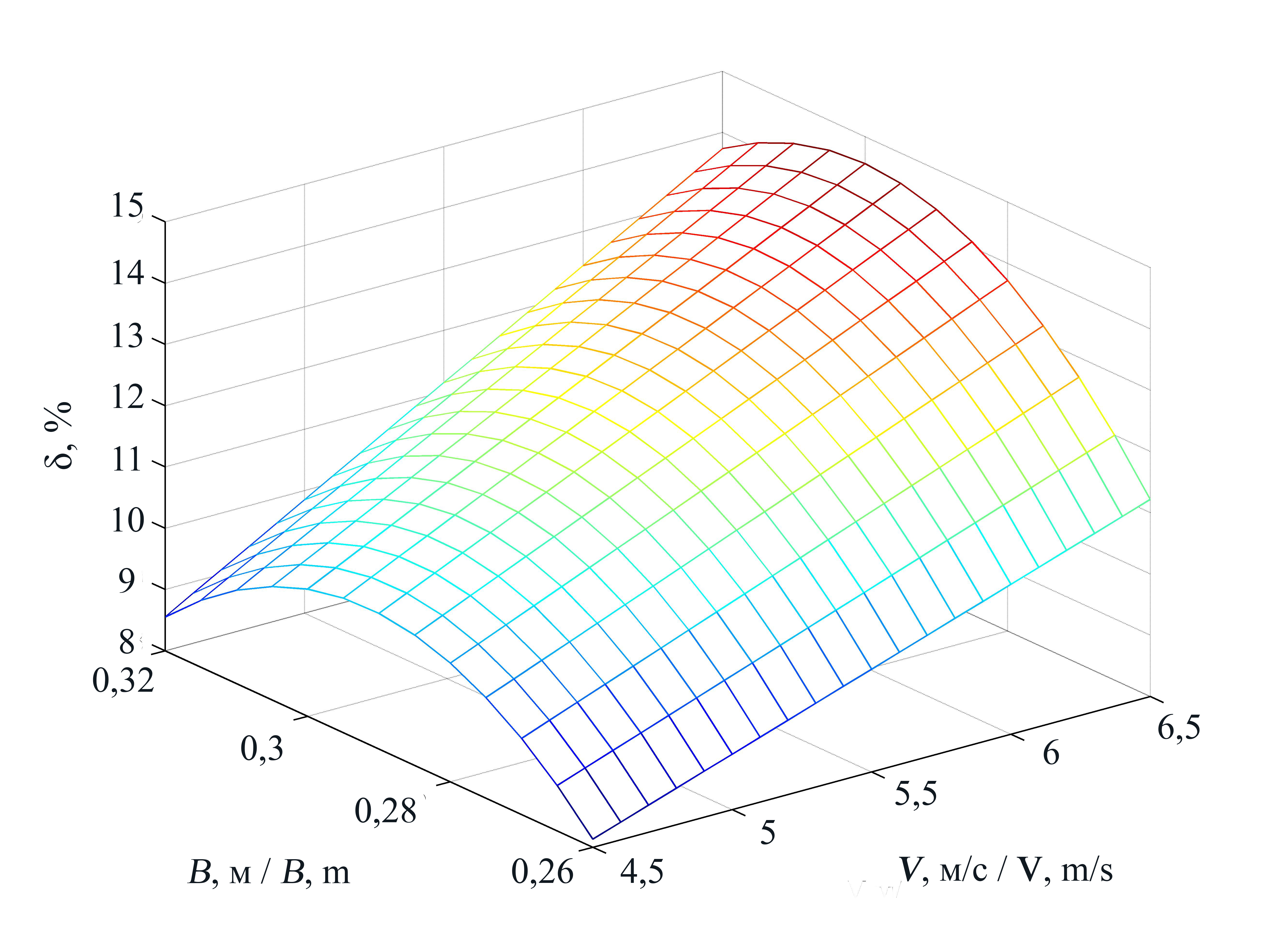 Рис. 4. Поверхность отклика (зависимость доли выделенной половы δ от скорости воздуха V и ширины B воздушного канала)
