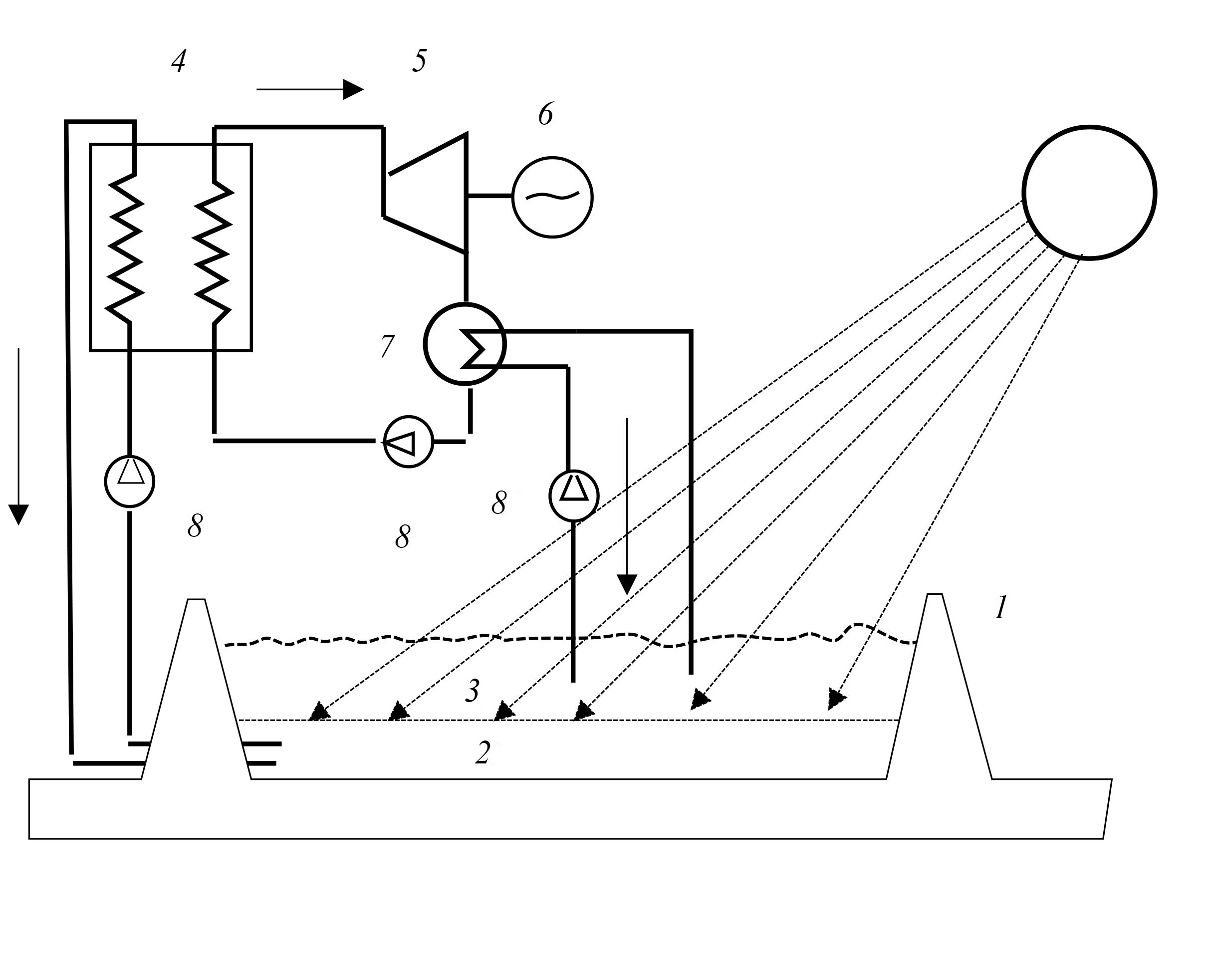 Работа электростанции по принципу «солнечного пруда» состоит из процесса поступления горячей воды из уровня 2 в испаритель (теплообменник) 4 с помощью насоса 8. Там находится парогенератор, в который идет низкотемпературный пар в турбину 5 (в виде низкокипящей жидкости). Турбина запускает движение электрогенератора 6. Затем пар отправляется в конденсатор 7, туда же поступает холодная вода из водоема 3 с помощью насоса 8. Схема функционирует в замкнутом цикле. Принцип работы рассмотренной системы не отличается от парогенераторных станций, где эффективность зависит от перепадов температуры между слоями горячей 2 и холодной 3 воды [15; 16].