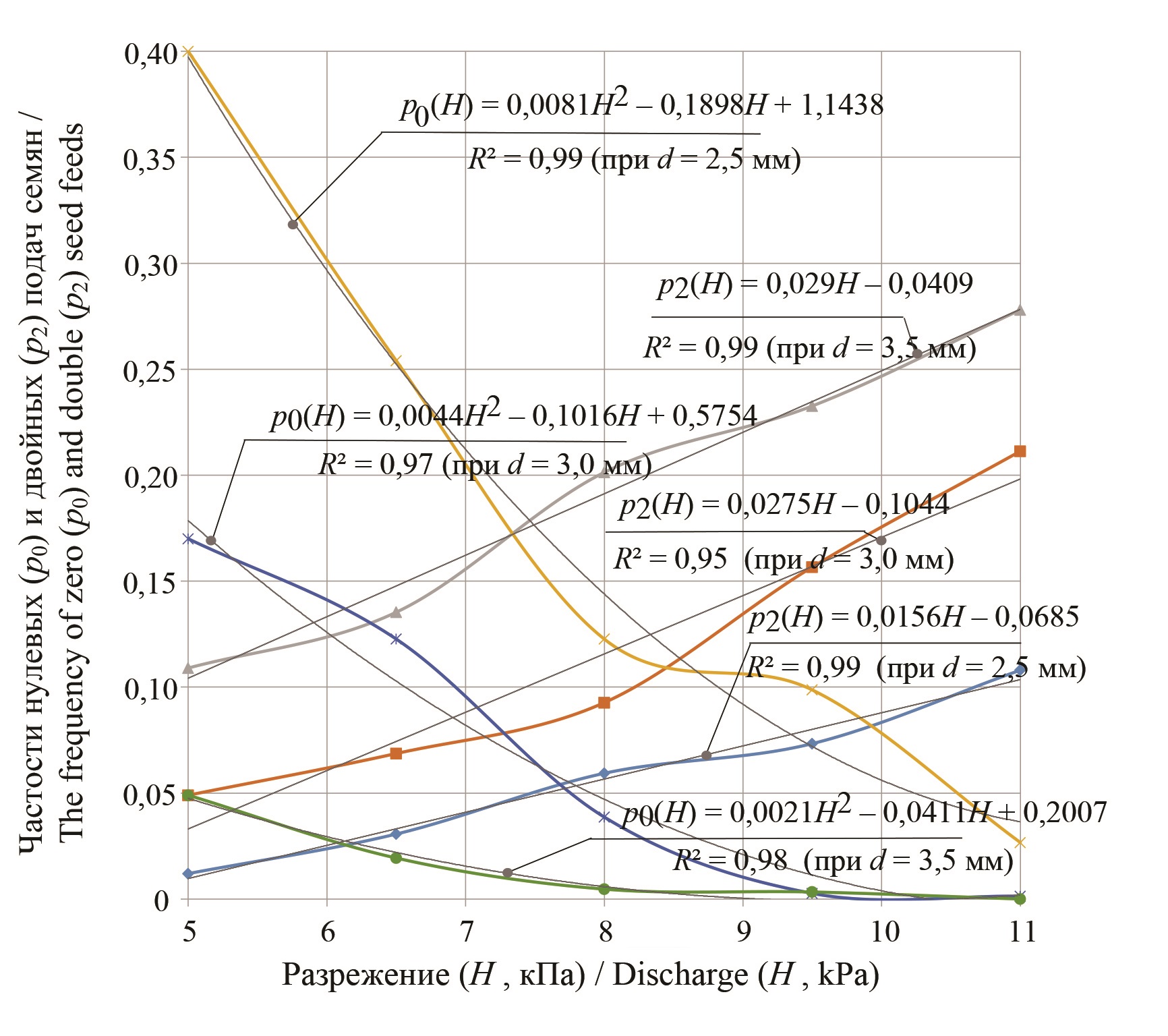 Суммарное решение полученных при аппроксимации данных (рис. 5) регрессионных уравнений позволило выявить соответствующие обобщенные зависимости частостей нулевых (3) и двойных (4) подач семян кукурузы: