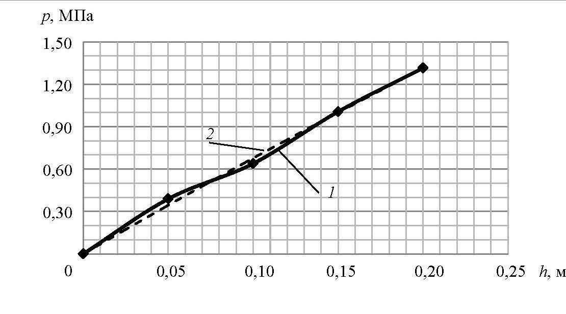 Рис. 7. Твердость почвы после выкопки картофеля при помощи лопаты: 1 – экспериментальные данные; 2 – график аппроксимирующей функции