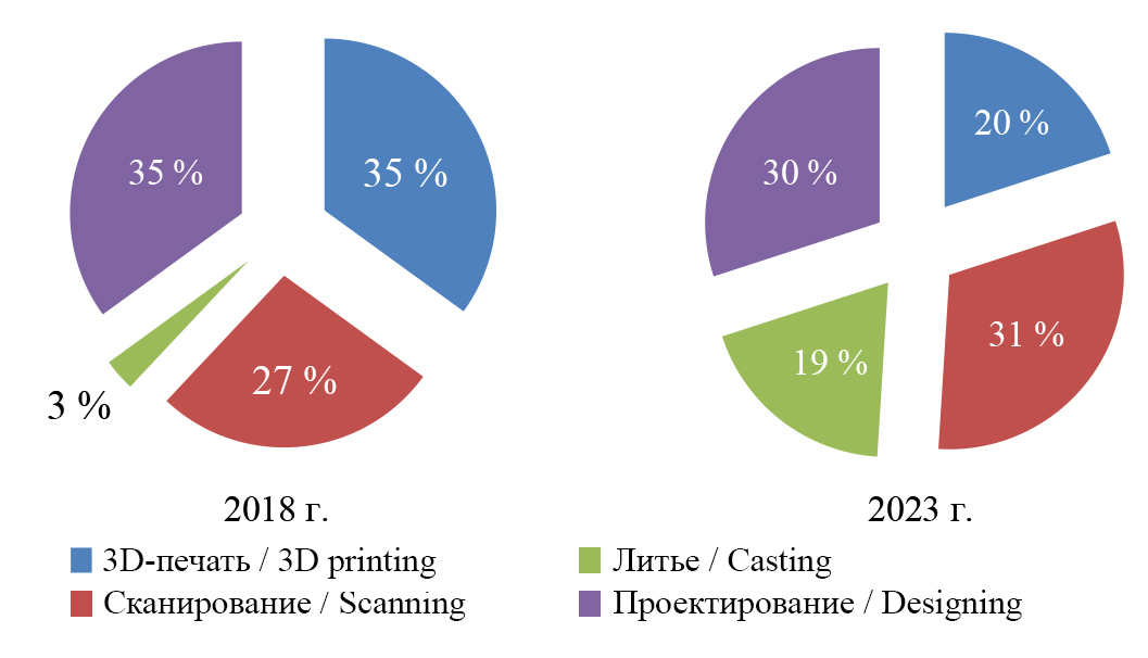 Результаты исследования. Для исследования состояния вопроса использовался материал, полученный в НИР на базе Центра проектирования и быстрого прототипирования «Рапид-Про» Национального исследовательского Мордовского государственного университета. Полагаясь на статистические данные за последние 5 лет, пришли к выводу, что изучение всех видов работ цикла аддитивного производства в последнее время становится актуальным. Наблюдается тенденция увеличения спроса на услугу 3D-сканирования и реверс-инжиниринг.
