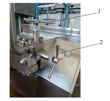 Рис. 1. Гомогенизатор. Узел регулировки давления: 1 – винт второй ступени; 2 – винт первой ступени