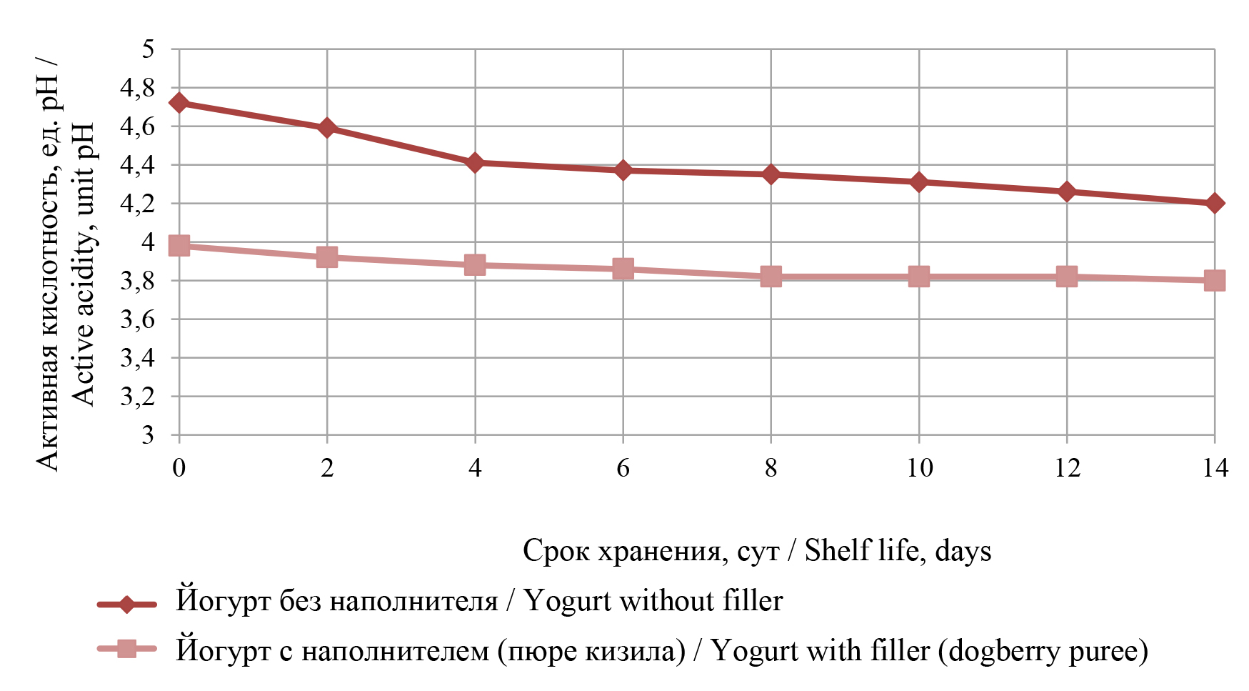 В процессе хранения йогурта до 14 суток активная кислотность нарастала (рис. 4), что обусловлено активным развитием лактобактерий. На 14-е сутки хранения кислотность йогурта без наполнителя достигает значения 4,2 ед. рН, йогурта с наполнителем – 3,8 ед. рН, что соответствует значению 140 °Т. По ГОСТ 31981-2013 «Йогурты. Общие технические условия» кислотность йогурта не должна превышать 140 °Т.