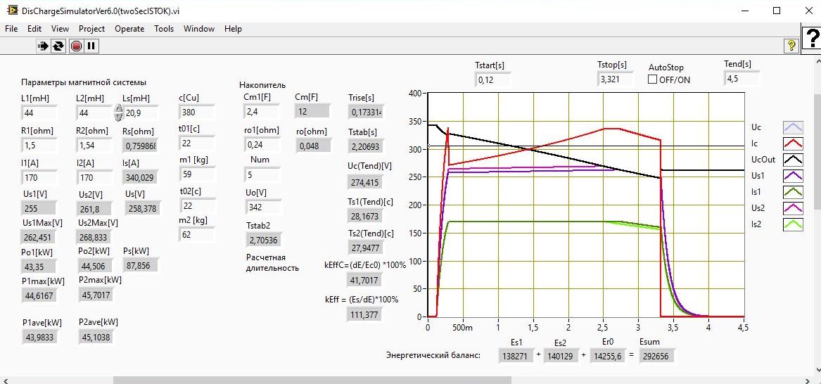 По завершению процесса моделирования определяется длительность стабилизации тока и коэффициент использования запасенной в накопителе энергии. Этот коэффициент является отношением потребленной за время протекания тока энергии к изначально запасенной и показывает эффективность использования энергии накопителя магнитной системой: