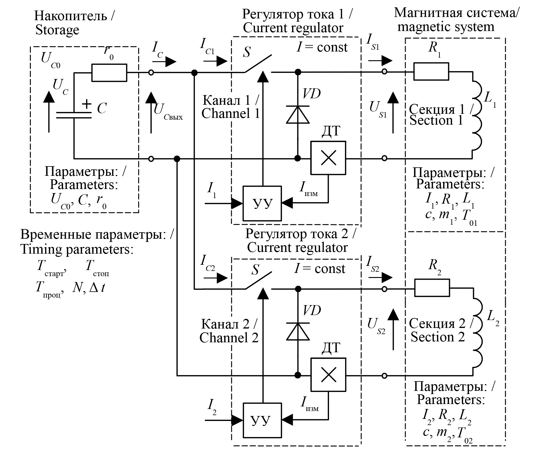 Результаты исследования. Схема питания двухсекционной магнитной системы, для которой реализована математическая модель, приведена на рисунке 4. Система состоит из накопителя, параллельно к которому подключены два регулятора тока, стабилизирующие ток заданной величины в секциях магнитной системы по мере разряда накопителя.
