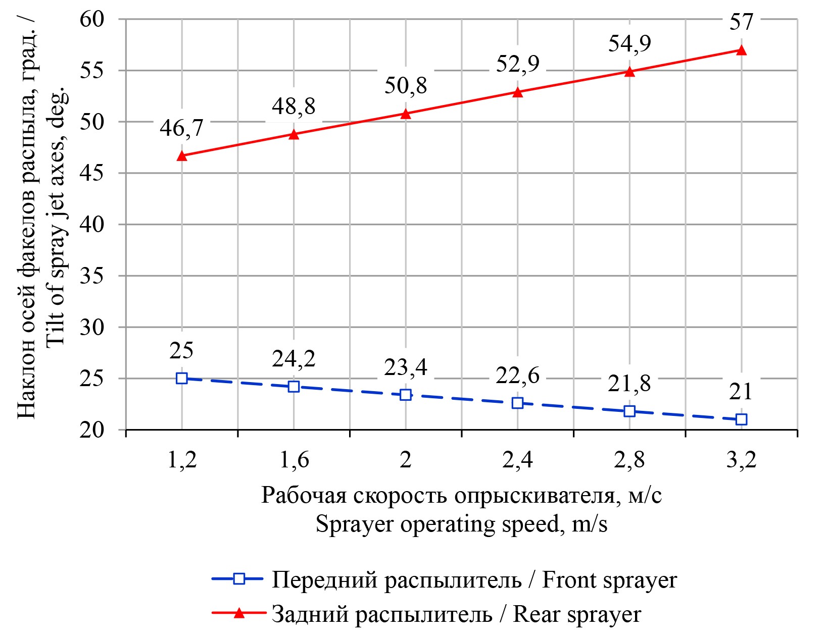 Из их анализа следует, что с повышением рабочей скорости опрыскивателя оптимальный угол наклона к вертикали оси переднего факела распыла α1 уменьшается, а заднего α2 ‒ увеличивается.