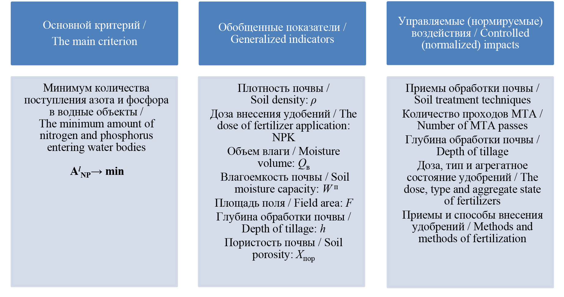 На основе анализа литературных источников и экспертной оценки в качестве основных и наиболее значимых показателей оценки выноса биогенных элементов в водные объекты были установлены: количество внесенных удобрений (азота и фосфора) в почву при возделывании сельскохозяйственных культур, объем влаги, полная влагоемкость почвы, площадь поля, глубина обработки.