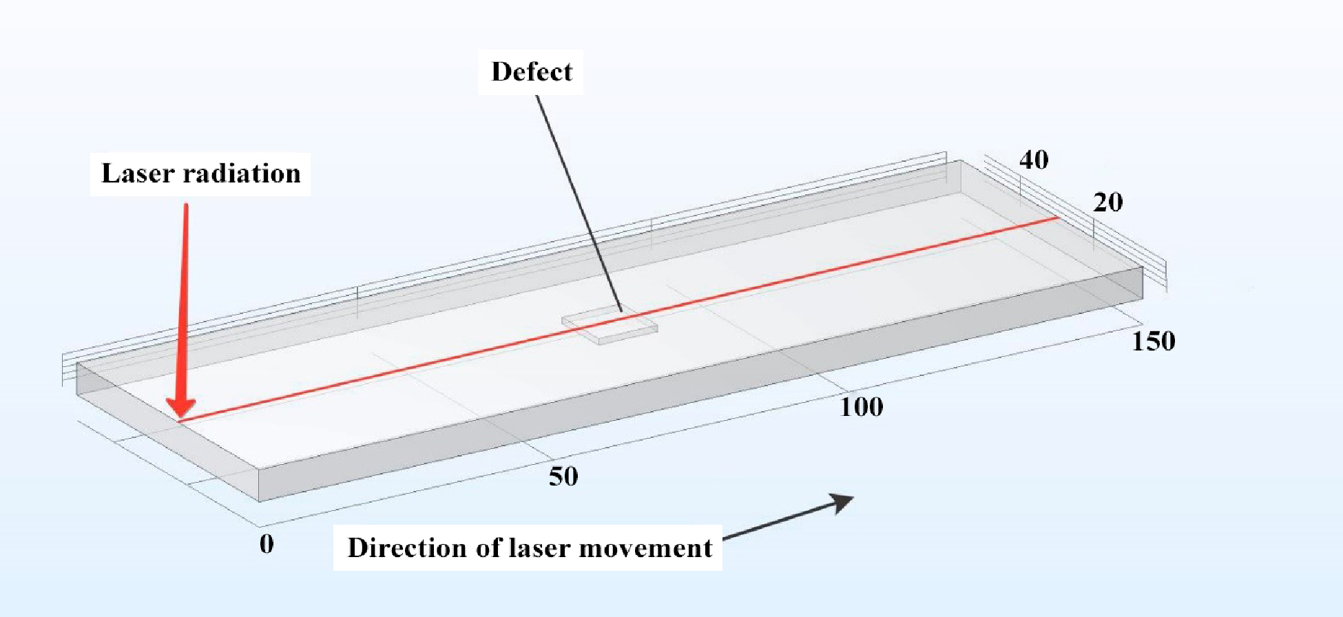 During the simulation, the heating spot moved along the middle line of the top face along the length of the sample long side. The following velocities for the laser beam moving were set: Vlaser = 5, 10 and 15 mm/s and the defect occurrence depth defdepth = 0.5; 1; 1.5; 2; 2.5 mm.