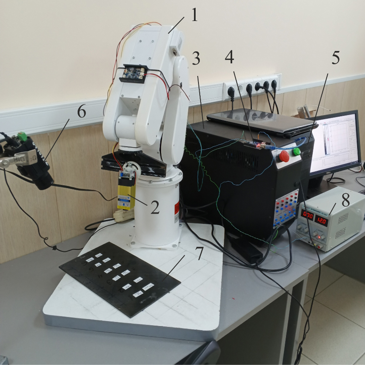 The basis of the robotic complex is a training and research manipulator with a spherical service area PASKAL DELTA 5Х-ARMDUINO (manufactured in Chelyabinsk (Russia). The Delta 5X robot (Fig. 5) belongs to the class of manipulators equipped with a direct computer testing system of the PCNC (Personal Computer Numerical Control) class. The robot control unit 3 receives data from the computer 5, interprets it and controls the movement of the working body 2 (laser) of the manipulator 1, energized by the power supply 8. The thermal imaging camera 6 COX CG640 is used to obtain information about the temperature field of the control object 7. It has uncooled long-wave bolometric detector with a resolution of 640x480 pixels, temperature sensitivity of no more than 30 mK, lens with a focal length of 20 mm and manual focusing.