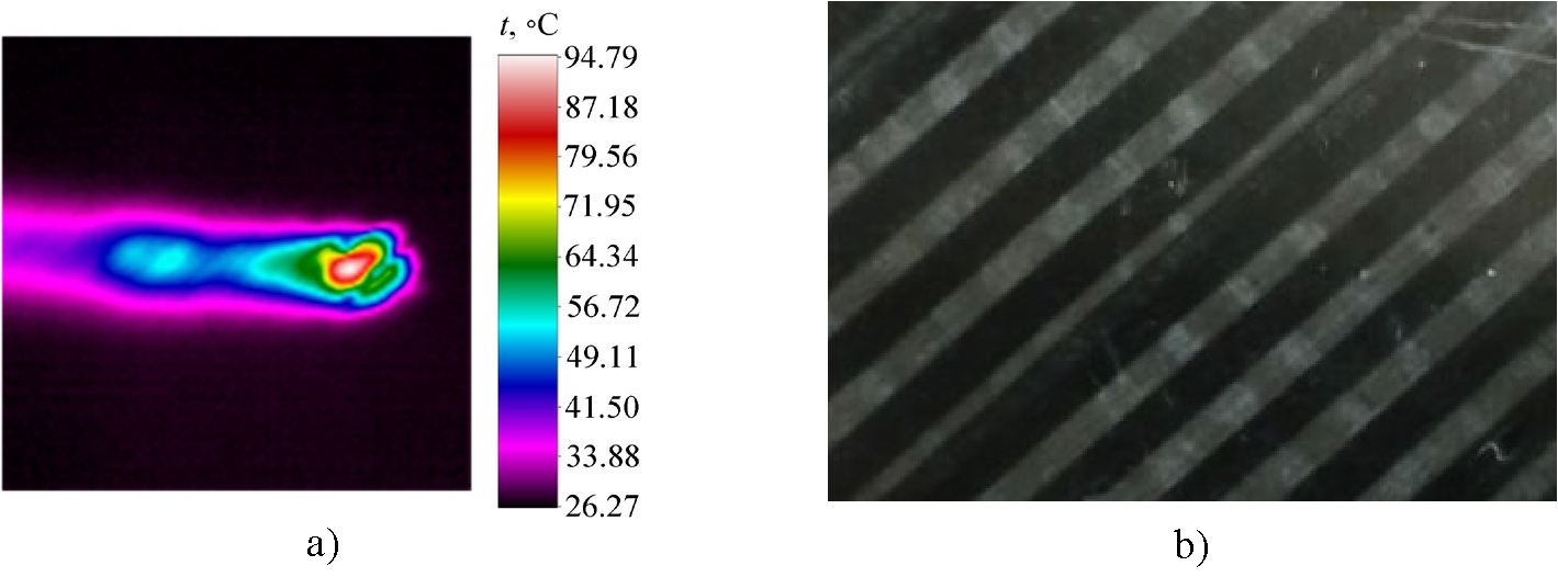 Fig.6. Temperature trace of a laser heating spot when passing through the product defect zone (a) and a photograph of the product material surface (b)