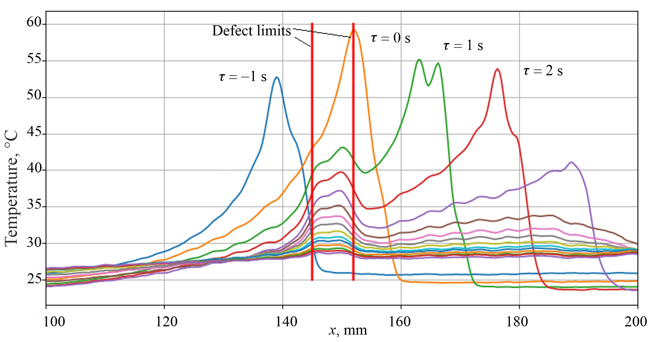 Based on the data obtained, the dependences of temperature on time and coordinate x in the defective (Fig. 7) and defect-free (Fig. 8) areas were revealed. The visible distortions of the temperature peaks at the moment of the heating spot passage of the sample area are explained by the inhomogeneity of the surface structure and thermal anisotropy of the material, which includes fibers with different emissivity degrees (Fig. 6b).