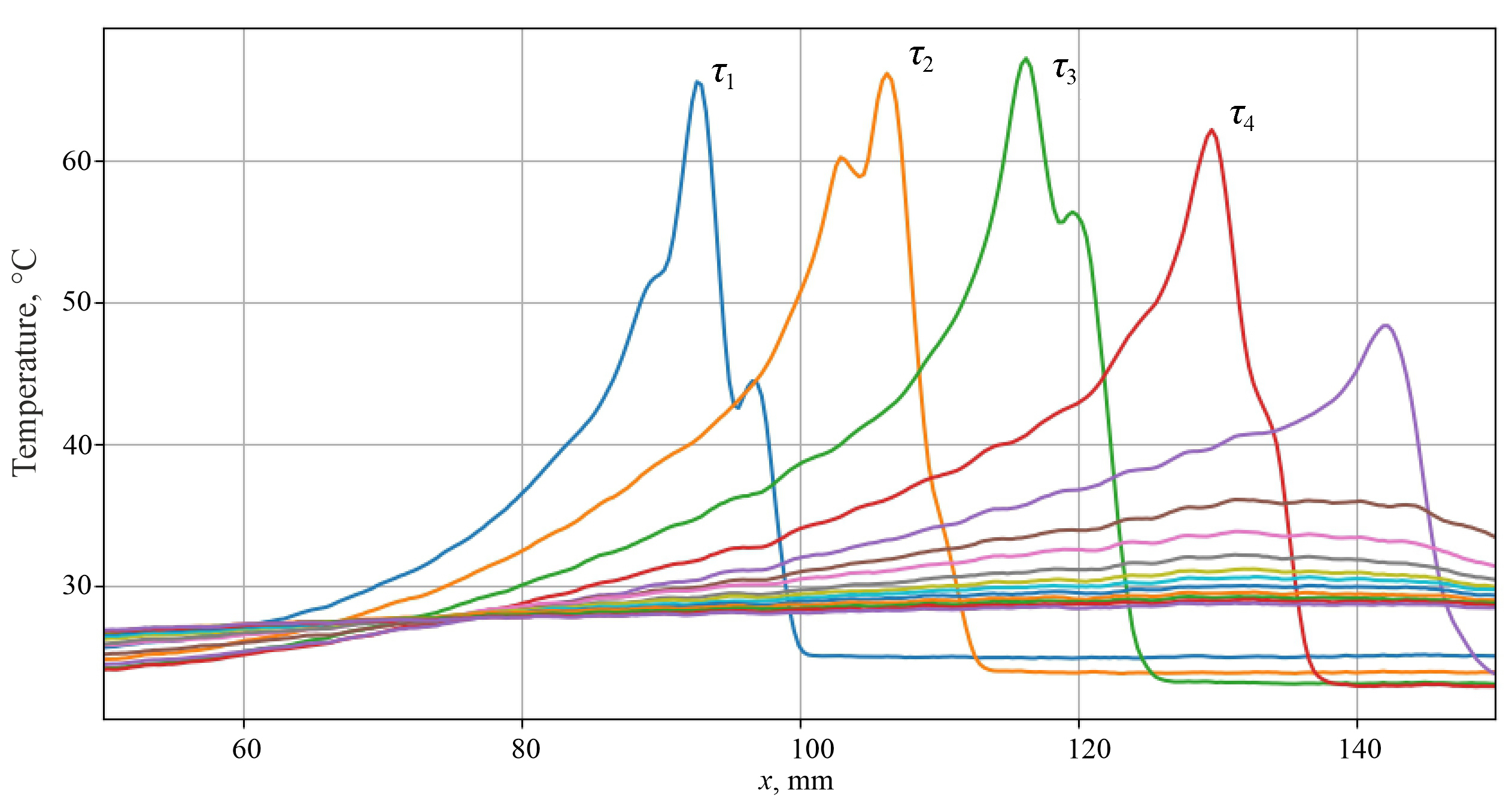 Fig. 11. Thermograms obtained for different times after passing the heating spot