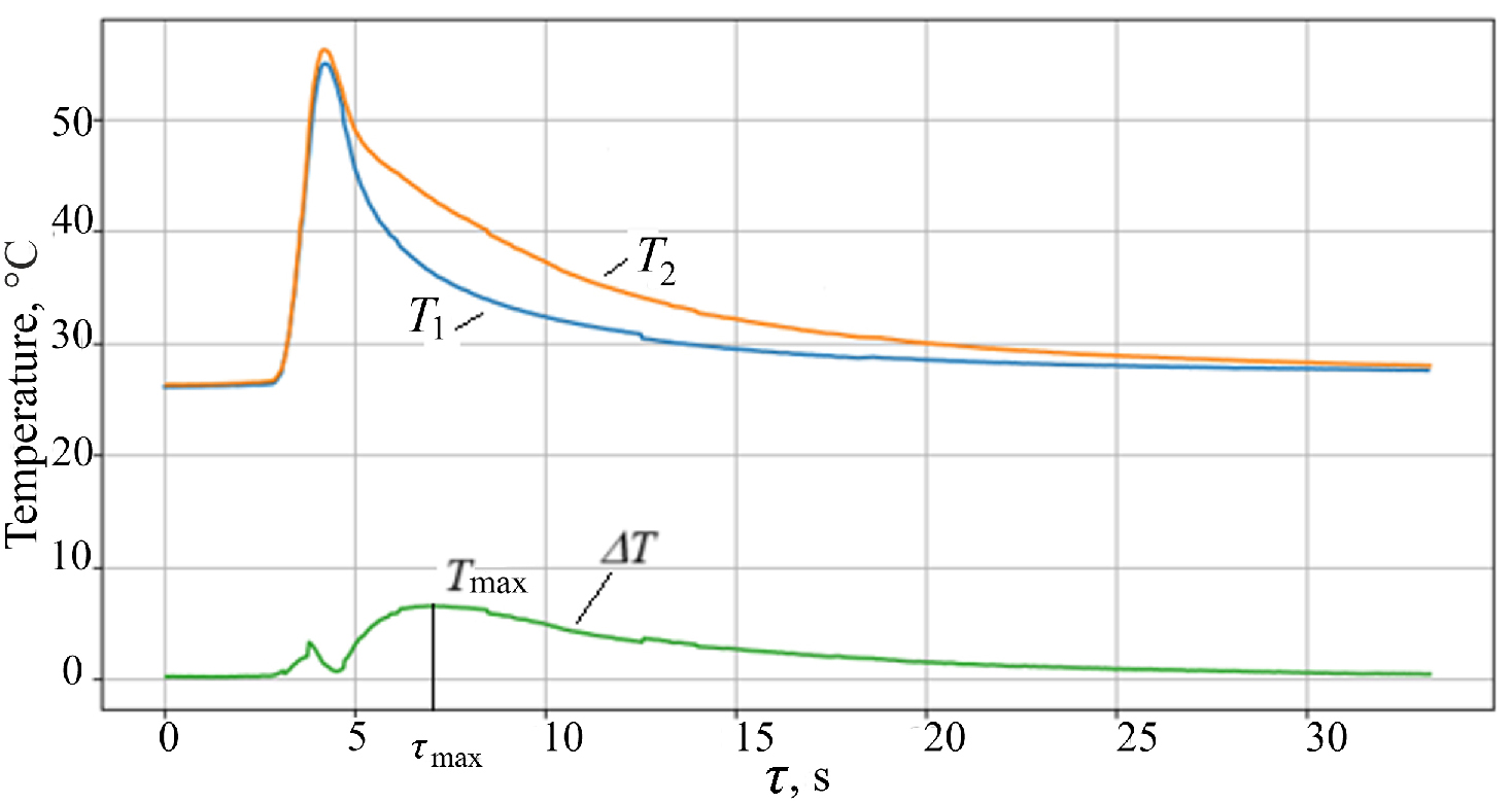 Temperature values T2 and T1 for constructing thermograms were taken as the average from an area of 20×20 pixels of the thermal image of the heating spot temperature trace (Fig. 6а).
