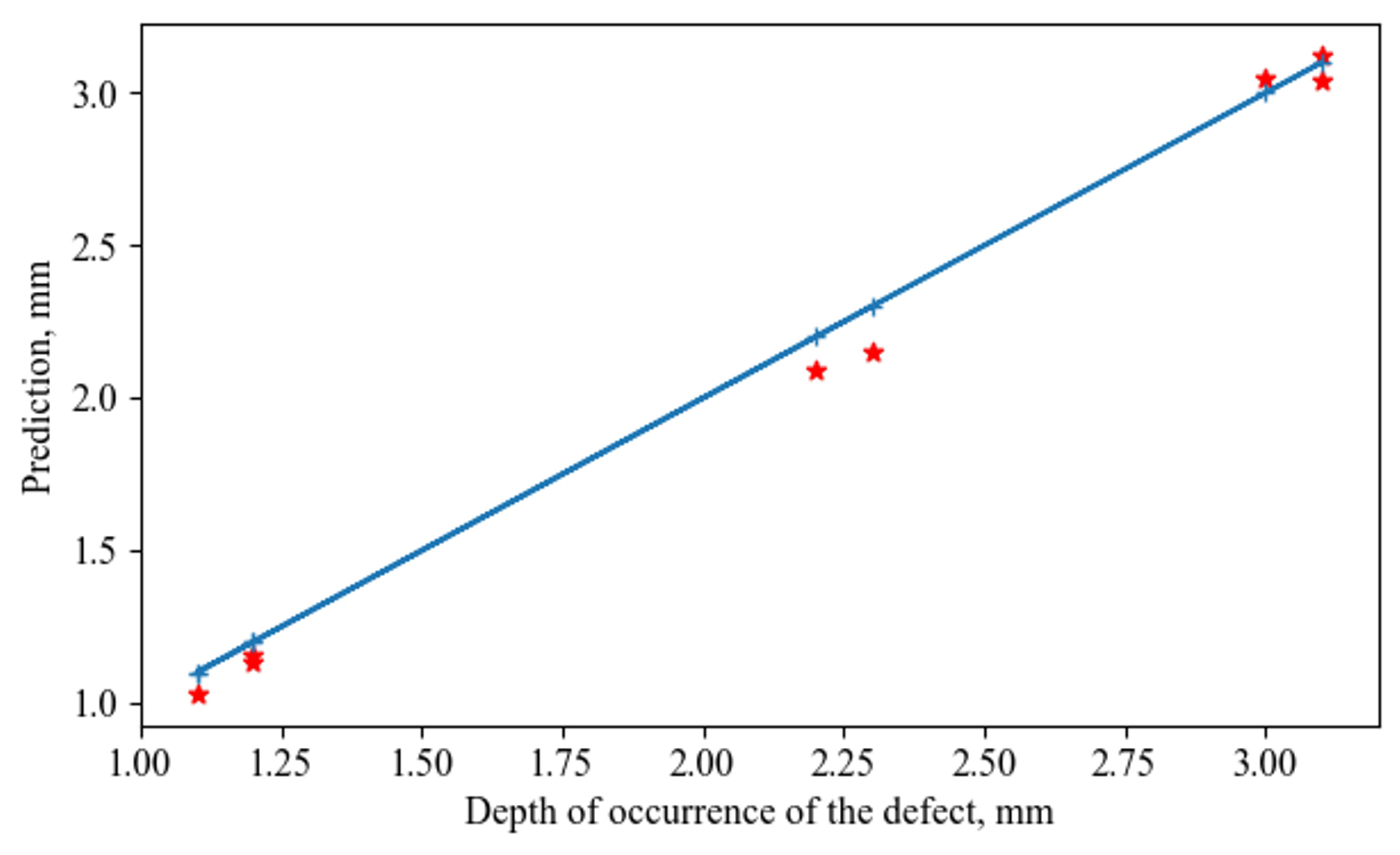Fig.10. Scatter diagram for the regression model for determining the defect depth of the (* means predicted values; + means a model)