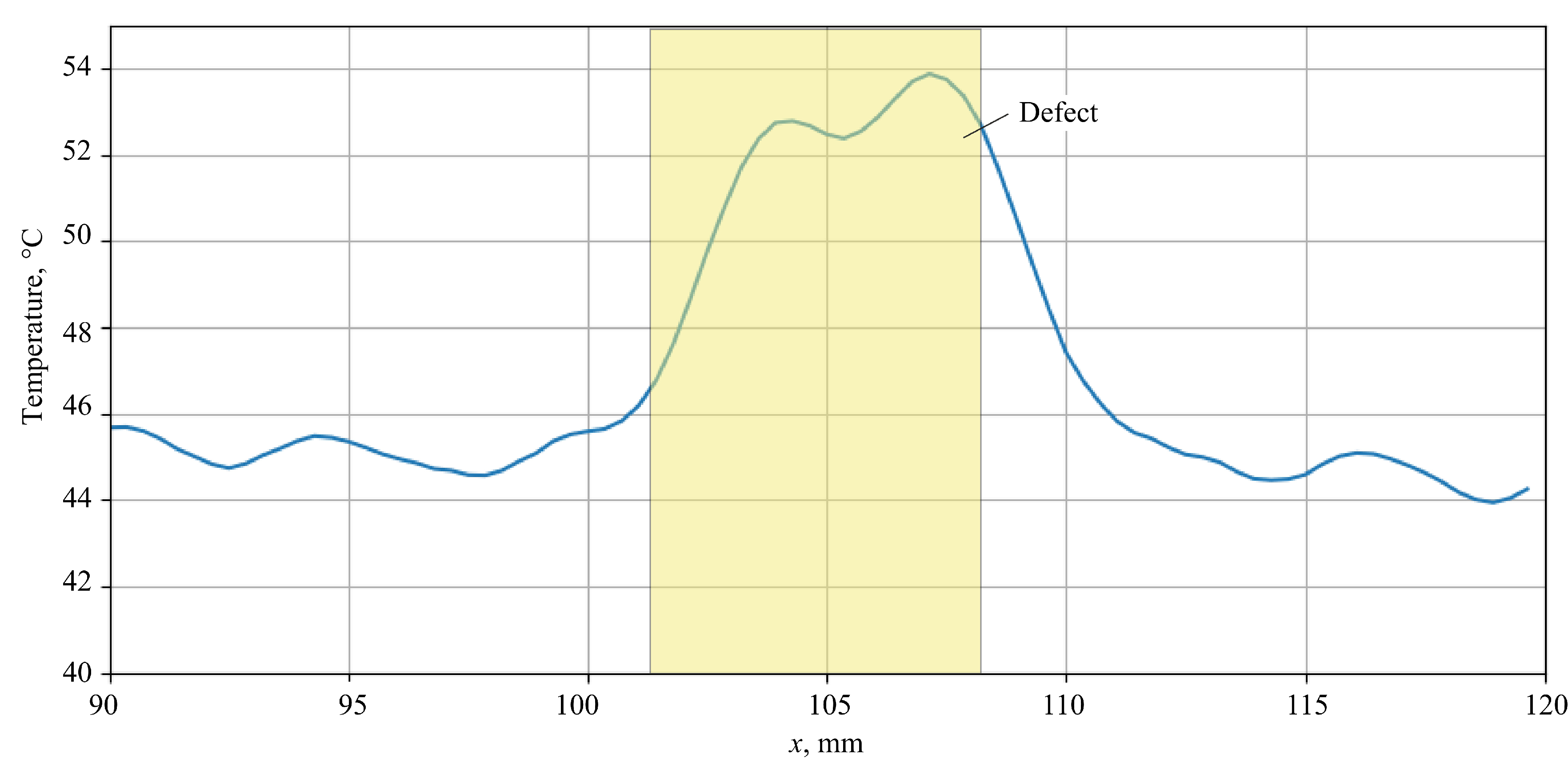 As a result of numerical modeling, there were found the data of temperature distributions on the surface of the sample along the laser scanning line. As an example there is given the temperature distribution (Fig. 2) across the red line (Fig.1) of a test sample containing a defect located at a depth of 1 mm. It can be seen that the presence of a defect significantly distorts the temperature field in the vicinity of the central point x = 75 mm. In this case, after the heating spot passes over the defect, the temperature difference (temperature contrast) between the defective and defect-free zones reaches its maximum.