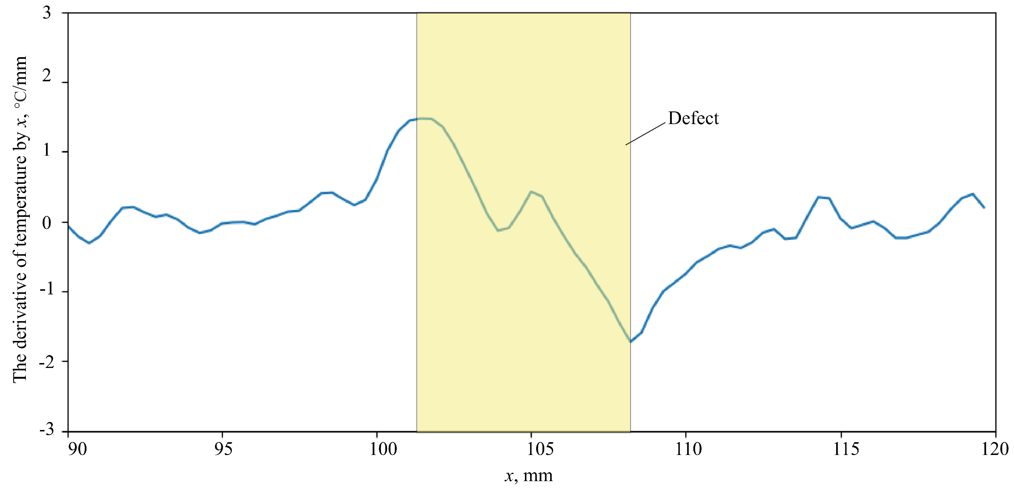 - The boundaries of defects are determined by local maxima of the first derivative according to the x coordinate for the obtained thermogram (Fig. 12). As experiments have shown, the measuring error in the defect width based on the maximum and minimum of the first derivative does not exceed 5% if the occurrence depth is up to 1 mm, and 10% if the occurrence depth is from 1 to 3 mm.