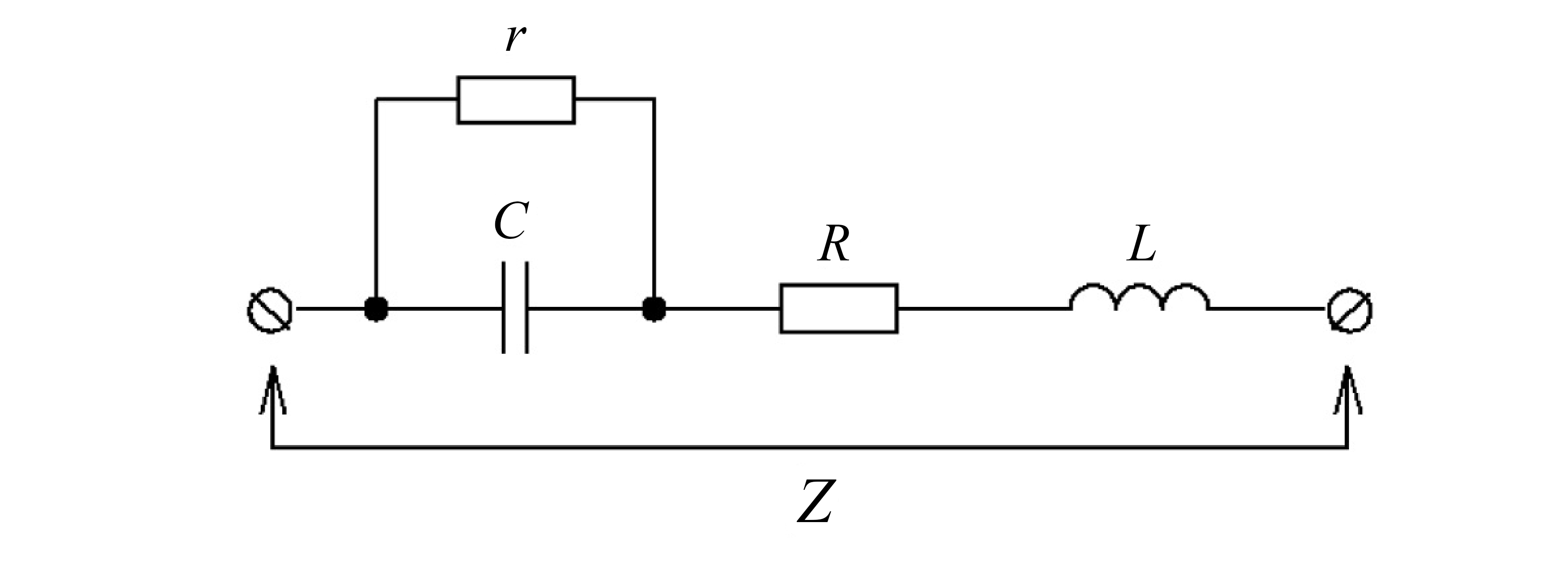 F i g. 1. Diagram of measurement of electrical parameters AT: Z – impedance; C – actual capacitance; r – resistance through the liquid (determines the leakage current); R – parasitic series resistance; L – parasitic series inductance
