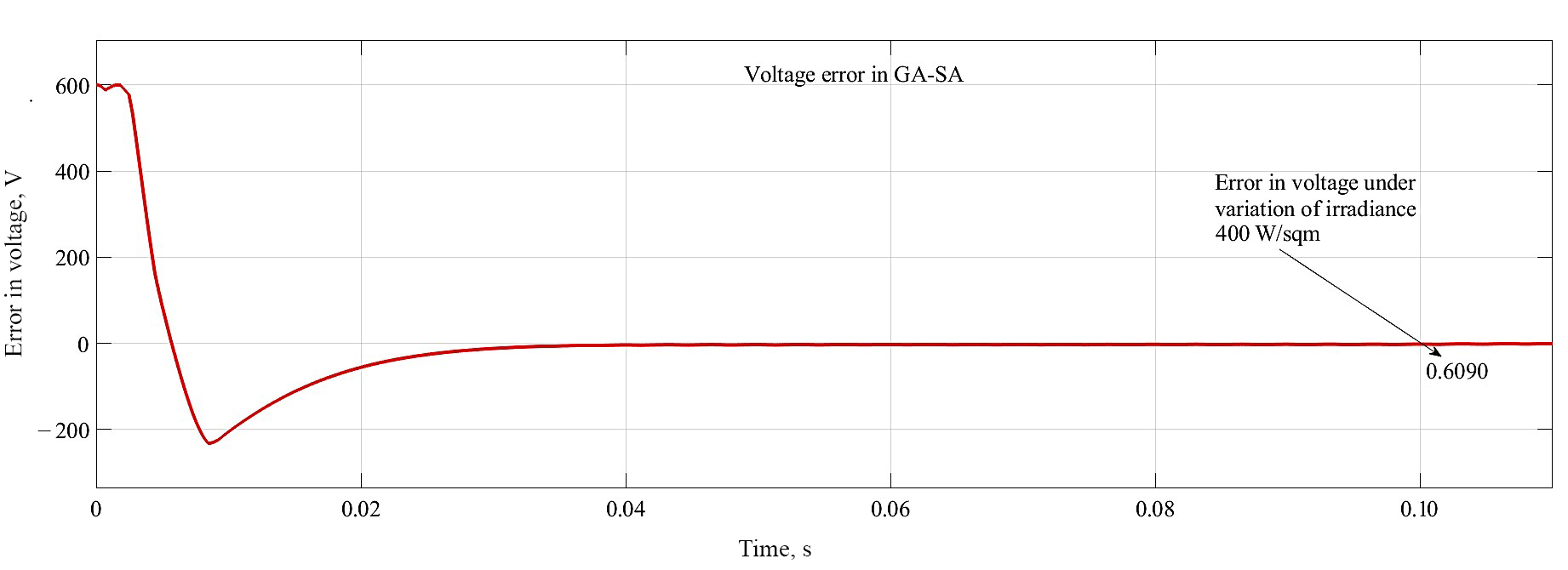 Minimization of error in DCL voltage with GA-SA optimization. Solar insolation is varied as of 1 000 W/sqm to 400 W/sqm at t = 0.1 s. As illustrated from Figure 12 the errors reach around at t = 0.1 s is 0.6090 V very close to zero.