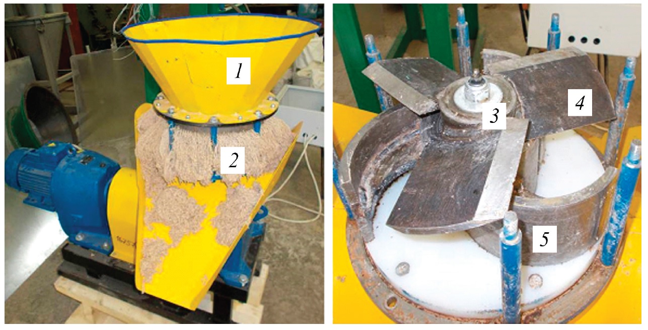 1 – feed hopper; 2 – perforated basket; 3 – drive shaft; 4 – splitters (knives); 5 – extrusion blades (adapted from [17])