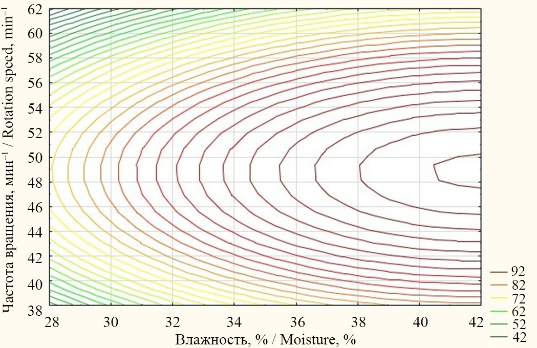 На рисунке 4 показано двумерное сечение поверхности отклика, характеризующее зависимость устойчивости гранул корма в водной среде от влажности сырья и частоты вращения рабочих органов корзинного гранулятора. Из графика на рисунке 4 видно, что наилучший результат процесса, при котором время распада гранул составляет 92 мин, достигается при влажности сырья 40,4–42 % и частоте вращения рабочих органов корзинного гранулятора 47,5–50,2 мин–1. При повышении влажности сырья до 42 % и частоты вращения рабочих органов до 50,2 мин–1 происходит увеличение времени распада гранул, которое при дальнейшем увеличении их значений сменяется снижением водостойкости гранул корма.