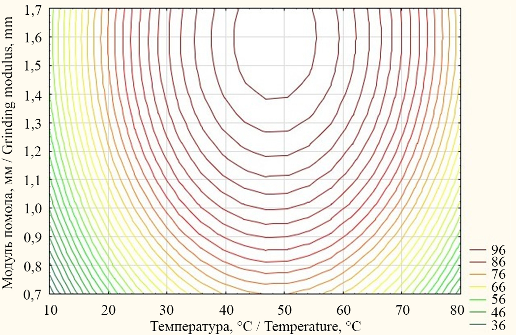 На рисунке 5 показано двумерное сечение поверхности отклика, характеризующее зависимость времени распада гранул корма в воде от температуры сырья и модуля его помола. Из графика на рисунке 5 видно, что наилучший результат процесса, при котором время распада гранул составляет 96 мин, достигается при температуре сырья от 41,8 до 54,6 °С и модуле помола 1,39–1,8 мм. При увеличении температуры сырья до величины 54,6 °С и модуля помола до 1,8 мм происходит повышение времени распада гранул, которое при дальнейшем увеличении их значений сменяется снижением водостойкости гранул корма.