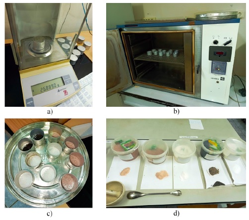 Отбирались две пробы в бюксы каждого образца удобрения и помещались в конвекционный сушильный шкаф (рис. 1b) для первого анализа. Для второго анализа разработана методика для определения влажности более плотных по структуре минеральных удобрений (нитроаммофоска, диаммонийфосфат, азофоска). Представлены образцы удобрений до размола (рис. 1c) и после размола (рис. 1d).