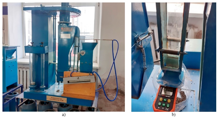 Скорость витания удобрений определялась экспериментально на парусном классификаторе «Петкус» (рис. 2а). Для определения скорости витания частиц удобрений и необходимого воздушного потока разработаны лабораторная установка и специальная методика.