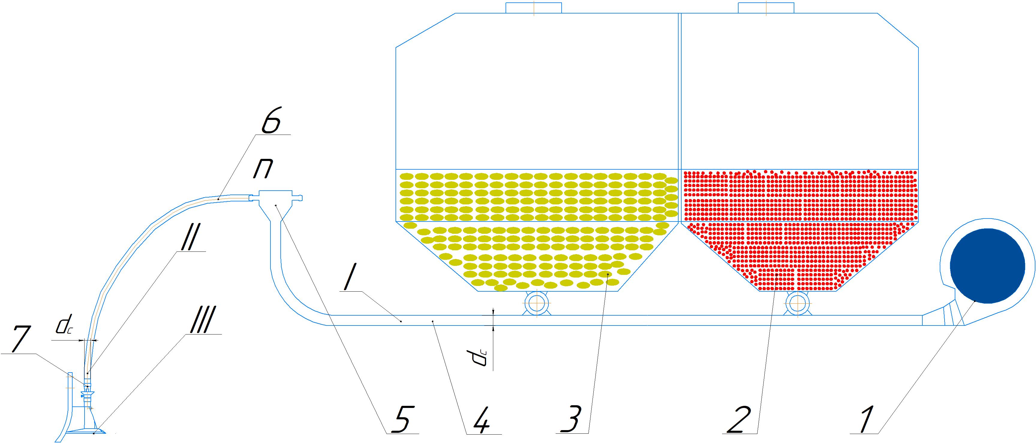 Цель исследования. Экспериментальная оценка параметров двухфазных течений в пневматической системе посевного комплекса, где в качестве несущей фазы используется поток воздуха, а в качестве дисперсной фазы – смесь твердых частиц гранул удобрений.