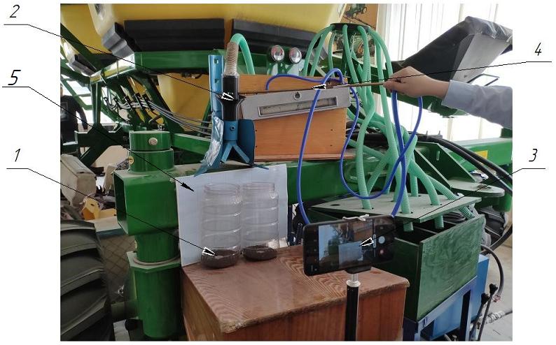 Определение интенсивности межфазного взаимодействия (объемной концентрации удобрений) и определение режима двухфазного течения (определение числа Рейнольдса, коэффициента сопротивления) в различных зонах пневмосистемы посевного комплекса. Для определения этих характеристик разработана лабораторная установка на основе бункера и распределительной системы посевного комплекса Джон-Дир 1910. Для измерения скорости воздушного потока использовался цифровой анемометр PM6252B. Он используется для измерения температуры окружающей среды, объема воздуха и скорости воздушного потока с диапазоном от 0,9 до 30,0 м/с. Для измерения динамического давления воздушной смеси и гранул удобрений использовалась трубка Пито-Прандтля. По динамическому давлению производили расчет скорости воздушного потока. Для измерения скорости движения удобрений использовалась методика замедленной фото- и видеофиксации перемещения частиц на разработанной лабораторной установке. По фотографии производили расчет пройденного расстояния одной частицы гранулы путем измерения его перемещения на миллиметровой бумаге.
