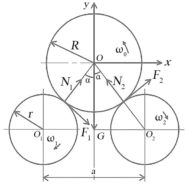 Рассмотрим вращение диска радиусом R = 0,027 м (соответствует средним размерам клубня картофеля), находящегося на вращающихся роликах радиусом r = 0,04 м с расстоянием между их центрами а = 0,09 м. Примем одинаковой частоту вращения роликов 4 с–1. Угол α при указанных выше значениях конструктивных параметров ≈ 42°.